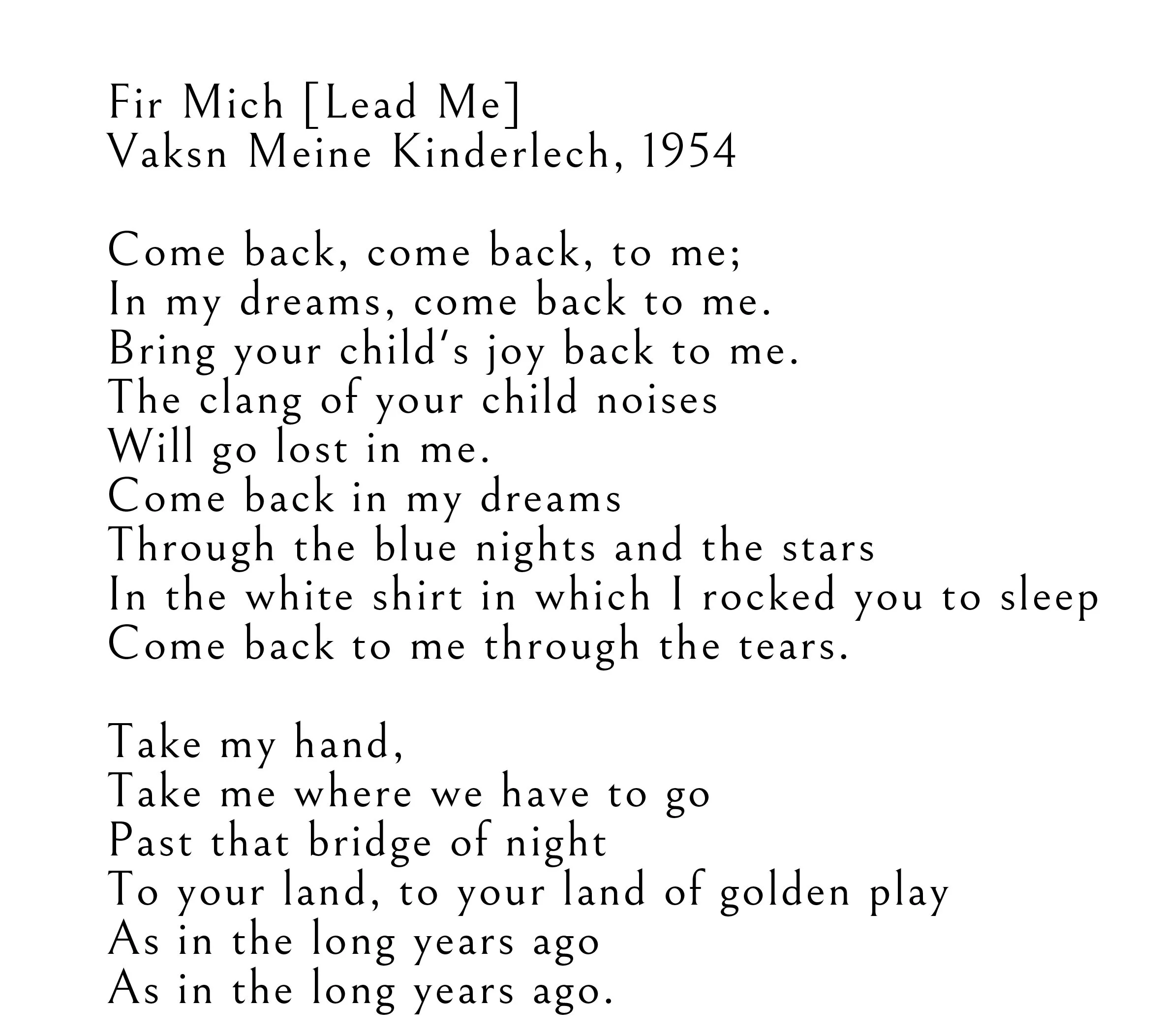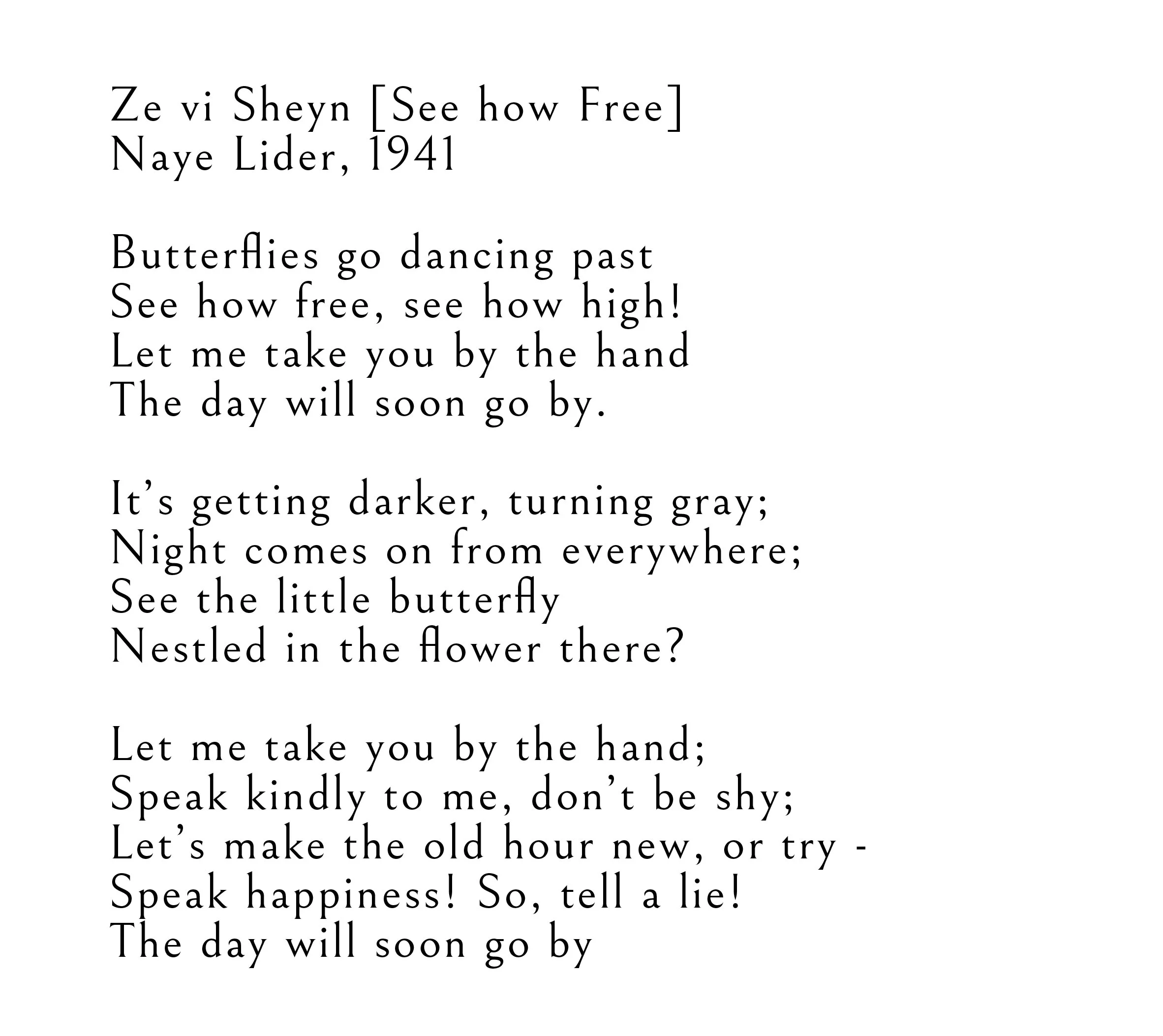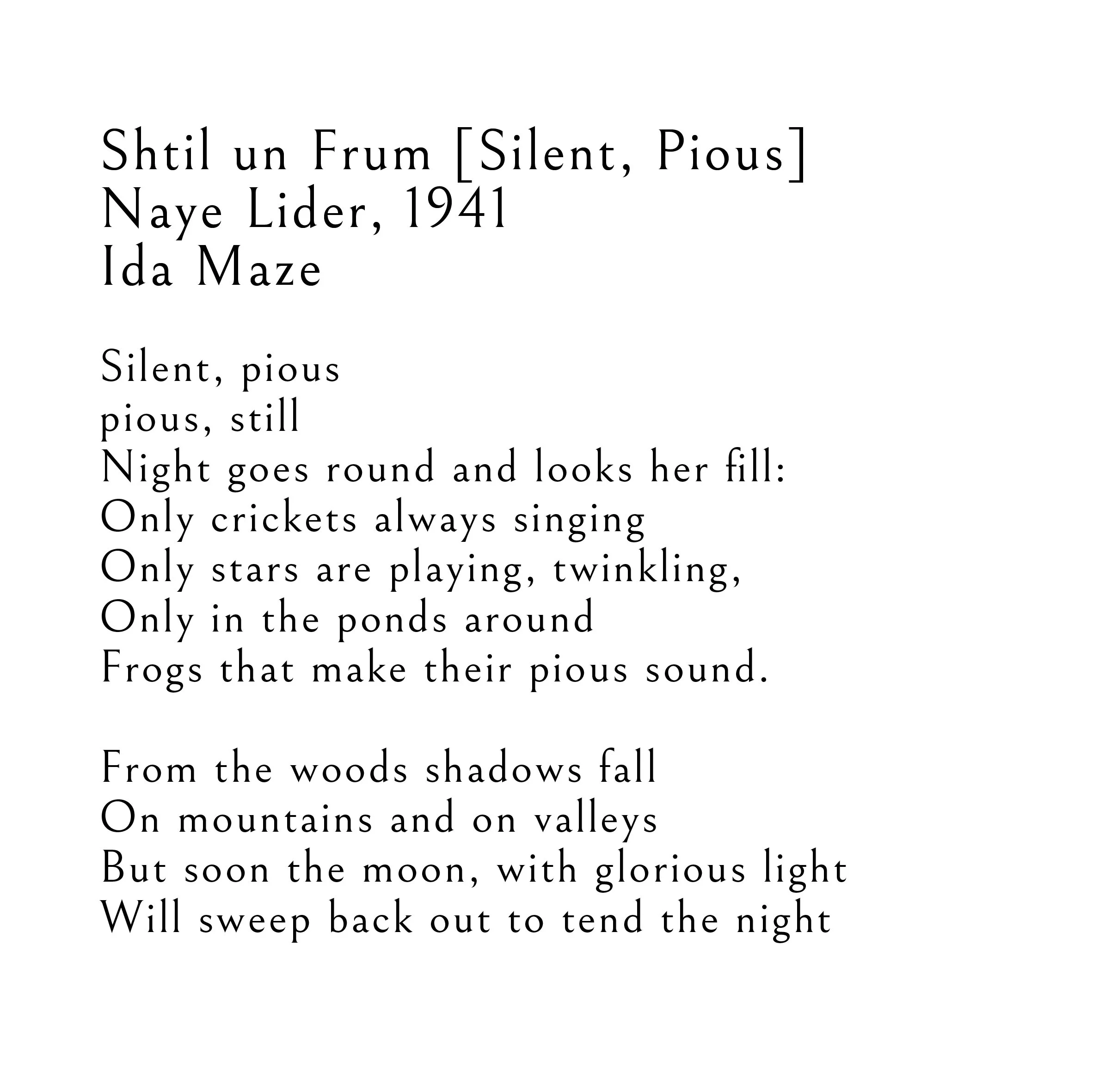 Below are the poem texts by Ida Maze featured in the video. Translated from the Yiddish by Irving Massey and recited by Sebastian Schulman